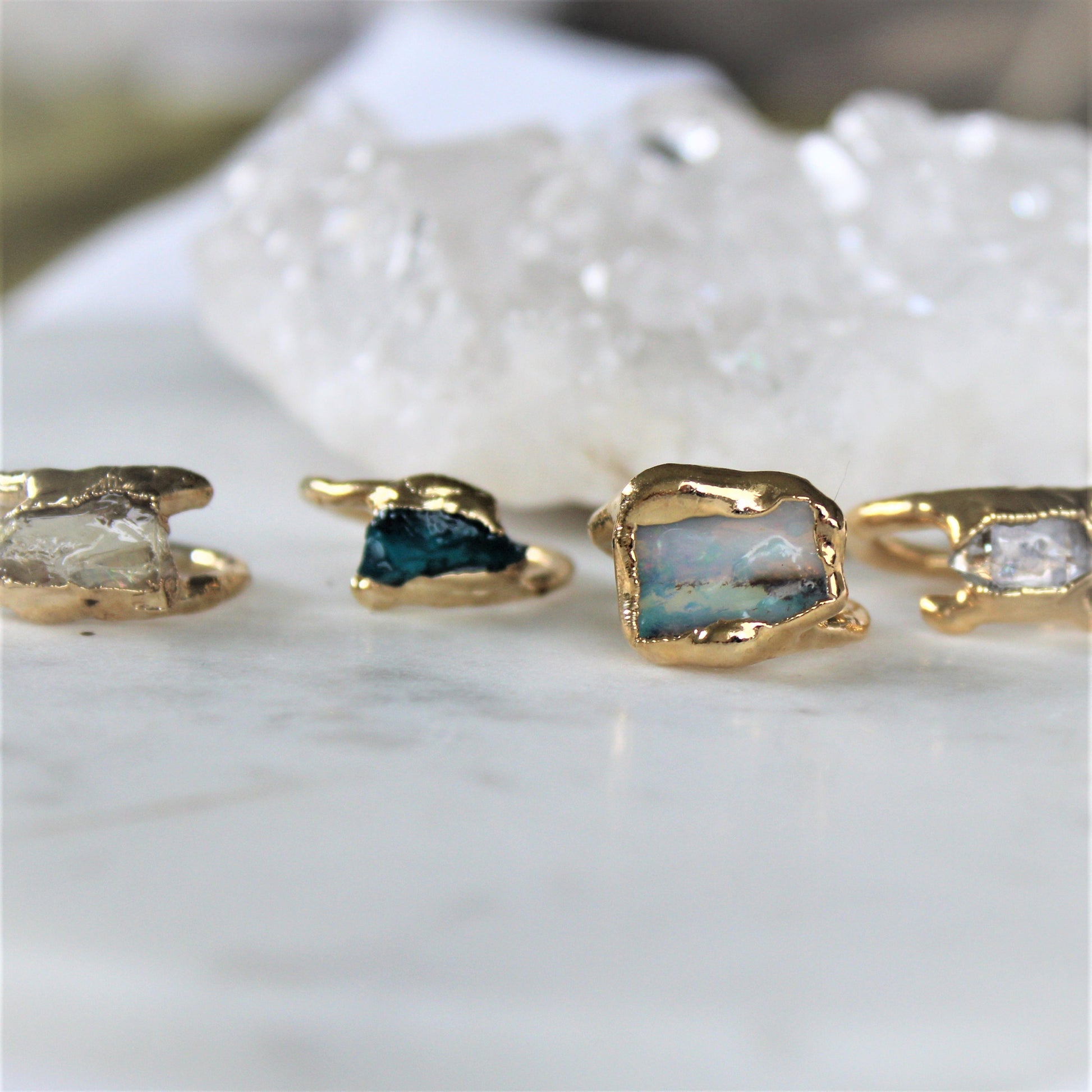 A single opal stone set in textured gold, chosen for its color and organic variation. The open, sculpted band leaves the stone exposed so it sits close to the skin, creating an intimate, balanced design. Dipped in textured 18k gold.
